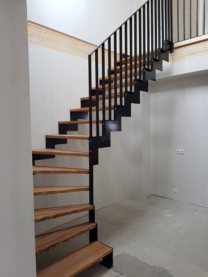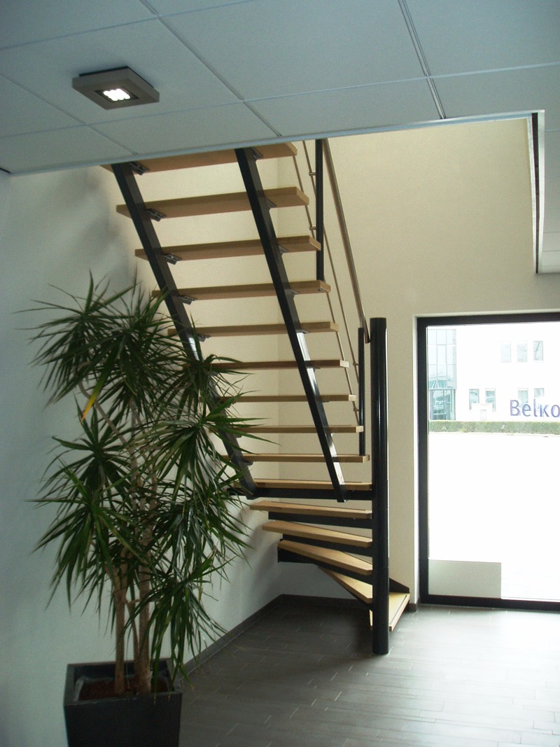 Een kwartslagtrap draait 90° en creëert een elegante en ruimtebesparende oplossing. Deze trap past perfect in moderne interieurs en bedrijfspanden.
